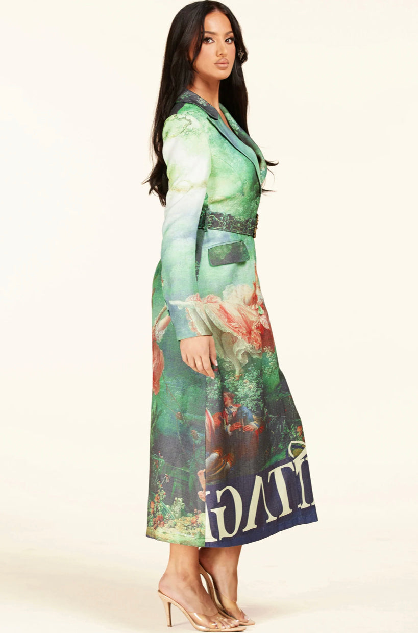 A luxurious Victorian picture is displayed across this forest green midi blazer dress and features a button-down front, two flap pockets at the hips, and it is gathered with a removable belt accessory.